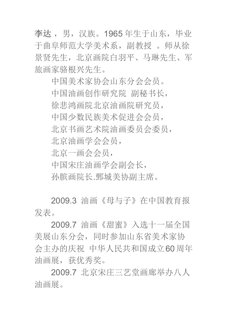 李达 ,男,汉族。1965年生于山东,毕业于曲阜师范大学美术系,副教授 . 中国美术家协会山东分会会员。中国油画创作研究院 副秘书长,徐悲鸿画院北京油画院研究员,中国少数民族美术促进会会员,北京书画艺术院油画委员会委员,北京油画学会会员,北京一画会会员,中国宋庄油画学会副会长,孙膑画院长.鄄城美协副主席,师从徐景贤先生,北京画院白羽平、马琳先生, 军旅画家骆根兴先生