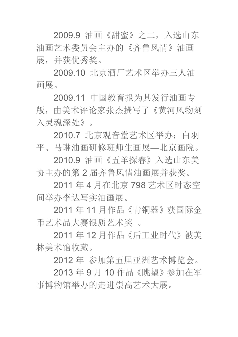 2009.7 油画《甜蜜》入选十一届全国美展山东分会,同时参加山东省美术家协 会主办的庆祝 中华人民共和国成立60周年油画展,获优秀奖。