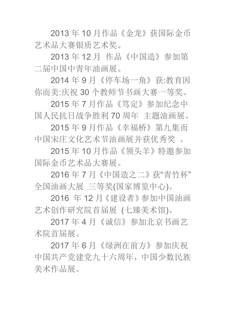 2016年7月《中国造之二》获“青竹杯”全国油画大展 三等奖(国家博览中心)。