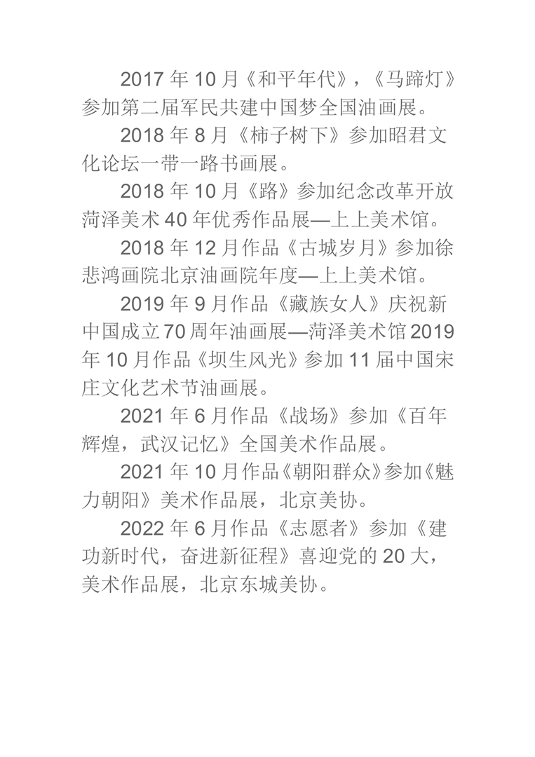2019年9月作品《藏族女人》庆祝新中国成立70周年油画展—菏泽美术馆2019年10月作品《坝生风光》参加11届中国宋庄文化艺术节油画展。